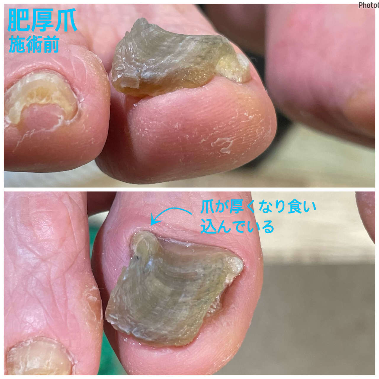 最近このような肥厚爪に対する施術も多くなってきました。肥厚爪は厚くなってしまった爪を削り見た目を良くすることは容易にできます。でも正常な爪の状態(爪先が指先の方向に伸びる状態)へと改善されるかはわかりません。肥厚爪になってどのくらい時間が経過してしまっているのかでも改善具合もかわってしまいます。ですので気がついたらなるべく早めに施術を受けられることをおすすめします。