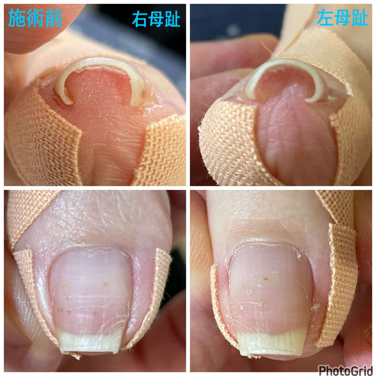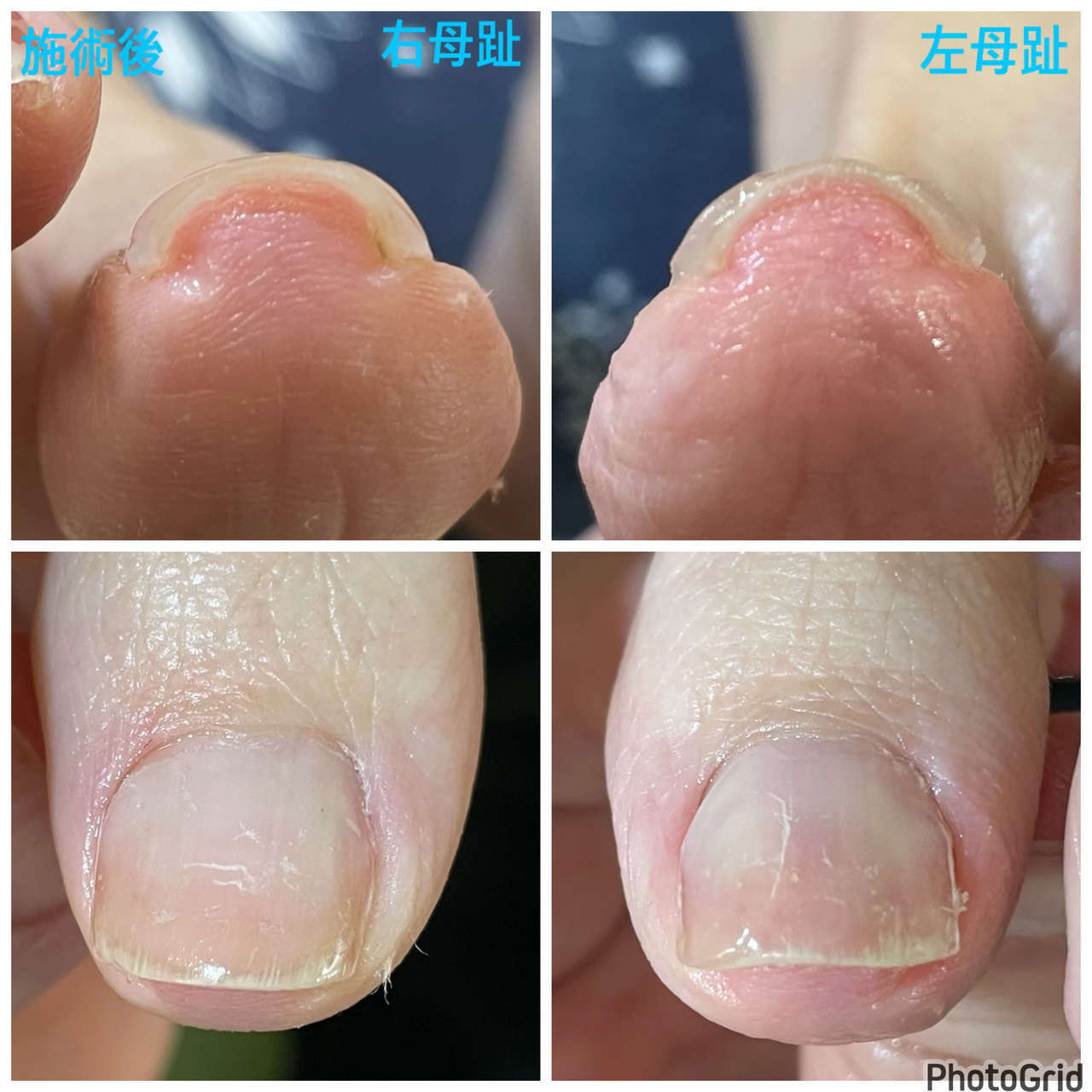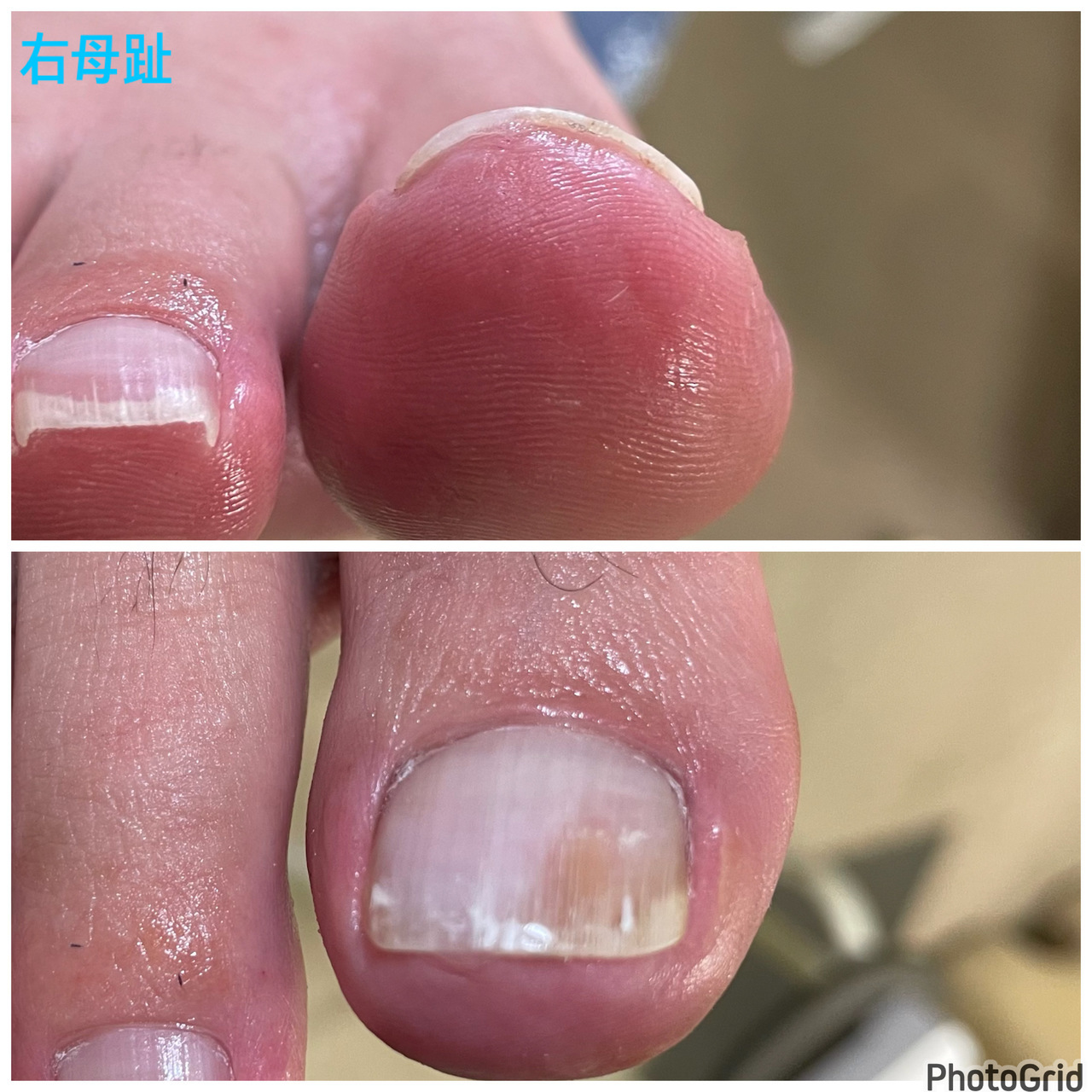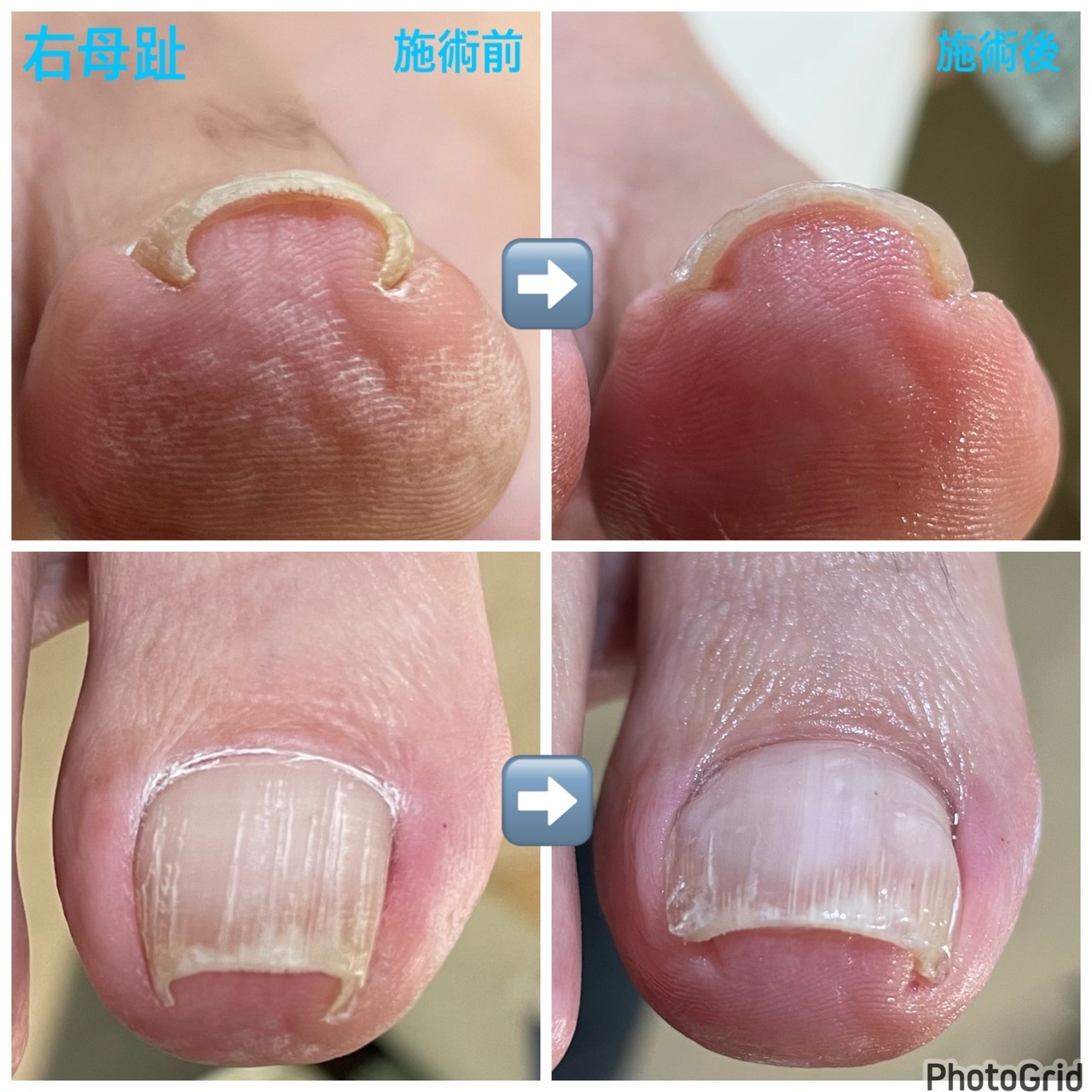 施術後は皮膚の食い込みから開放されています。痛みのみであればこの1回だけで改善されました。施術前と施術後の爪の幅の違いがよくわかる症例です。