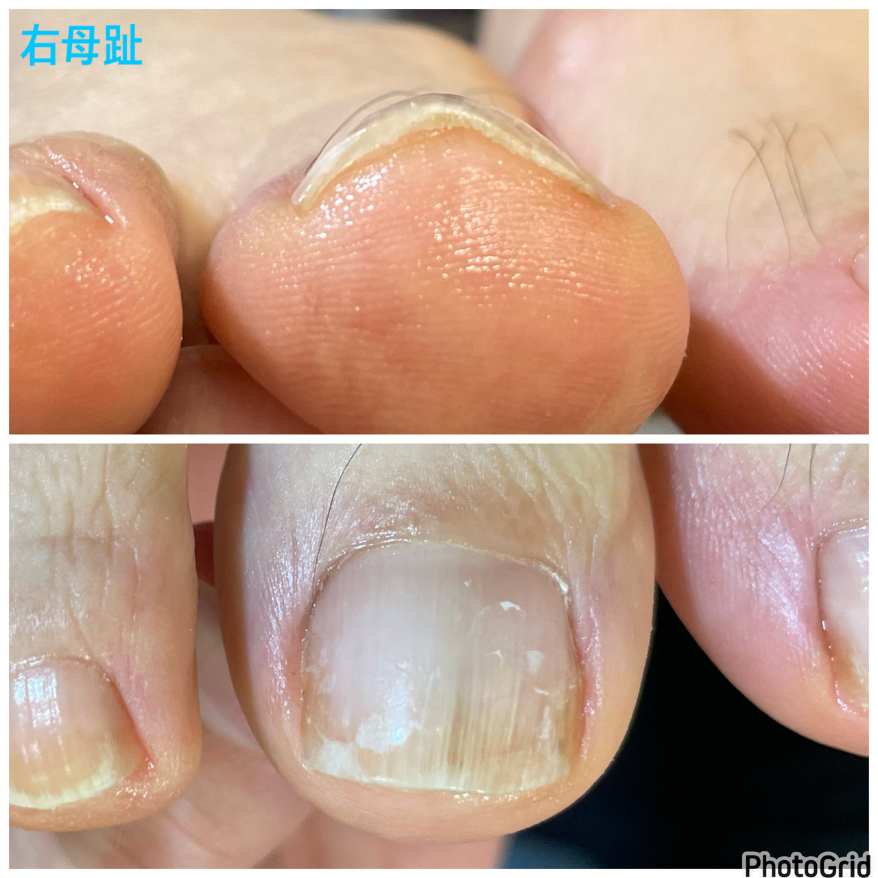 実はBeforeの写真は私が爪を切ってきれいに下処理をした後です。皮膚科さんでは爪を伸ばしなさいと言われ写真よりも5ミリ強爪が長い状態でした。ちょっとその状態でダンスなどの激しい動きをするには爪をはがしてしまう恐れがあったのでカットしました。もちろん適正な長さにです。