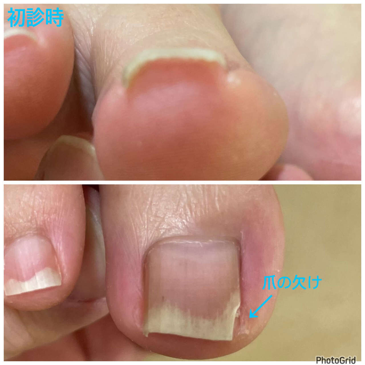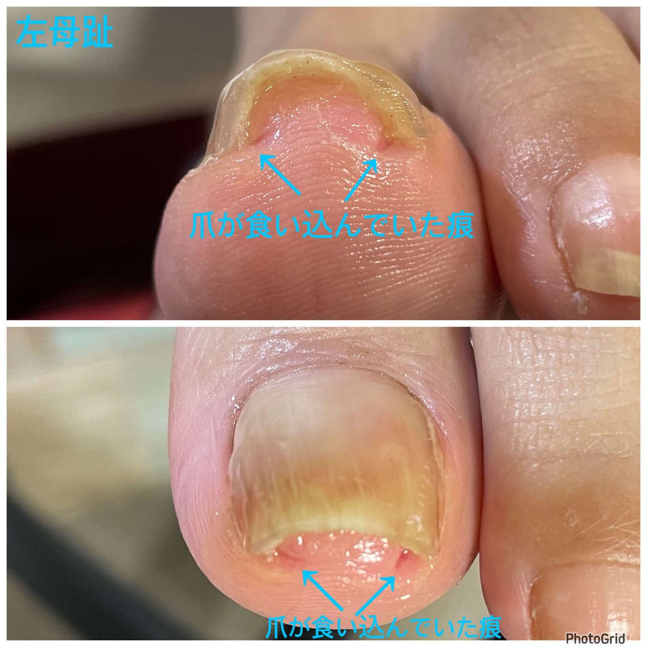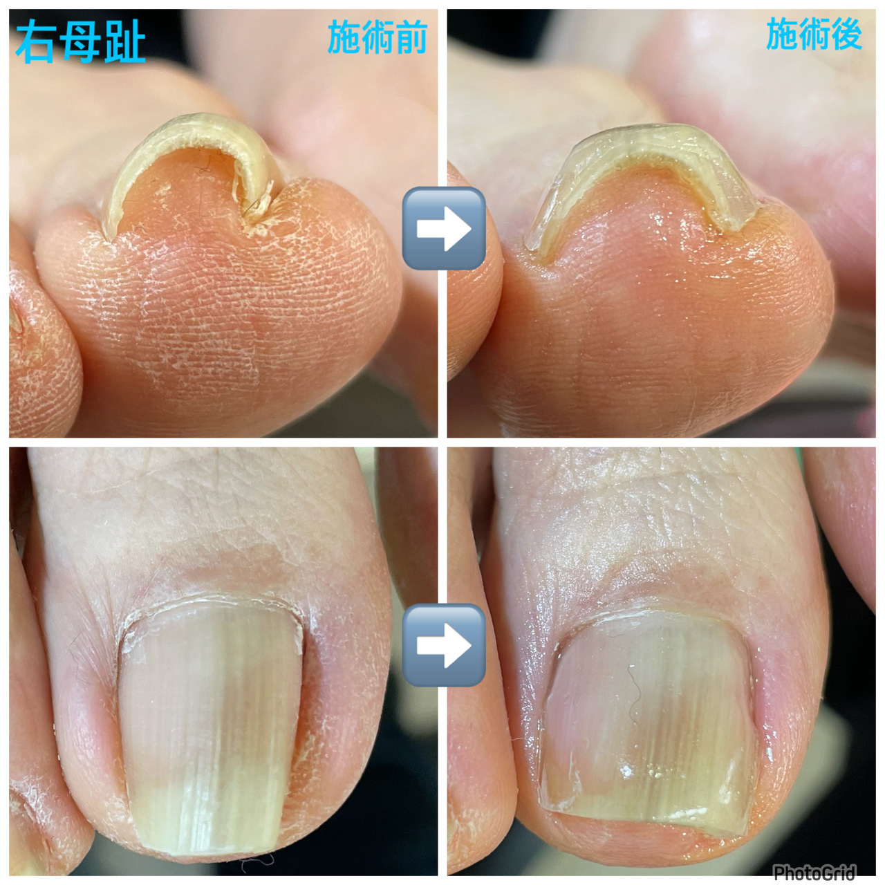 施術前の爪の食い込みを見ると痛そうですが痛みはなかったそうです。施術も痛みを感じさせずに終了しました。初診時の施術後が右の写真になります。